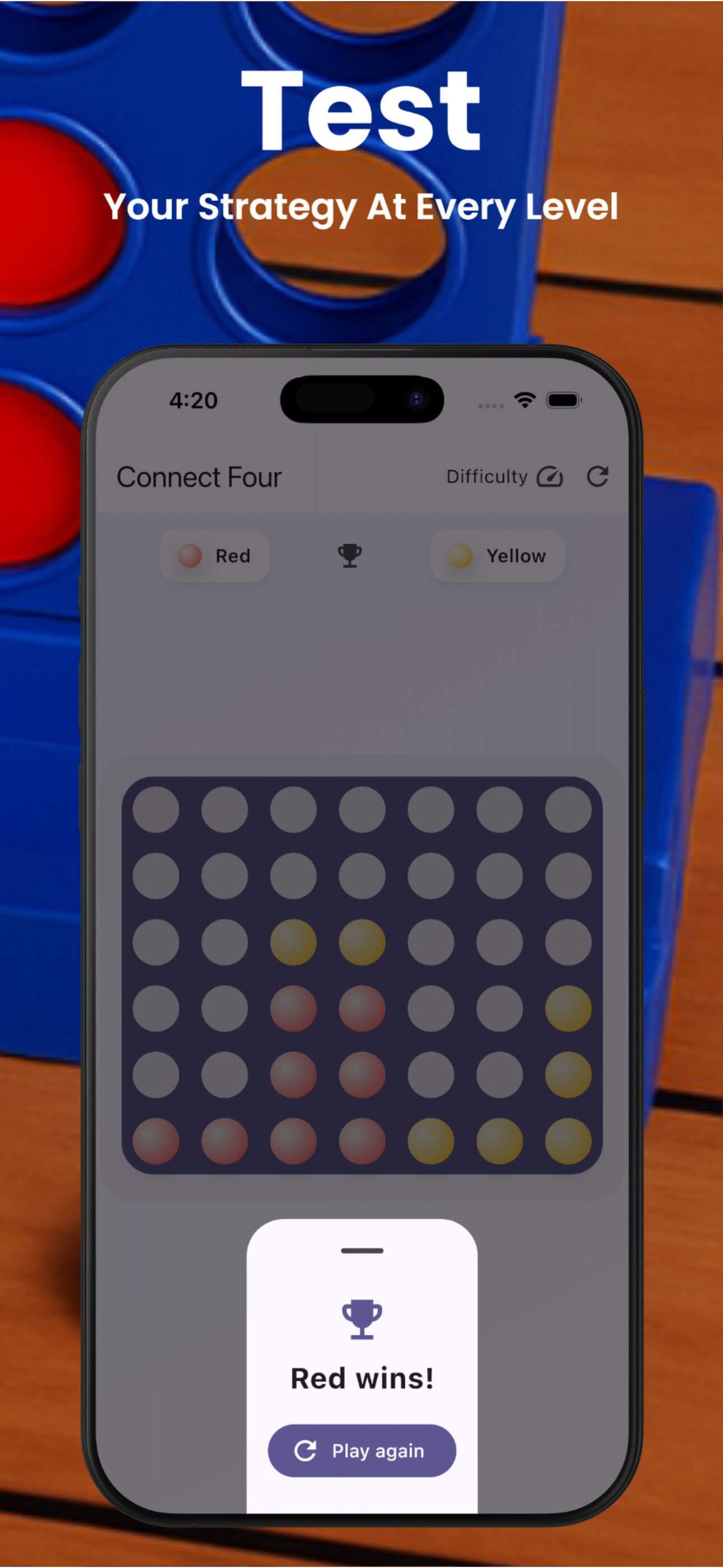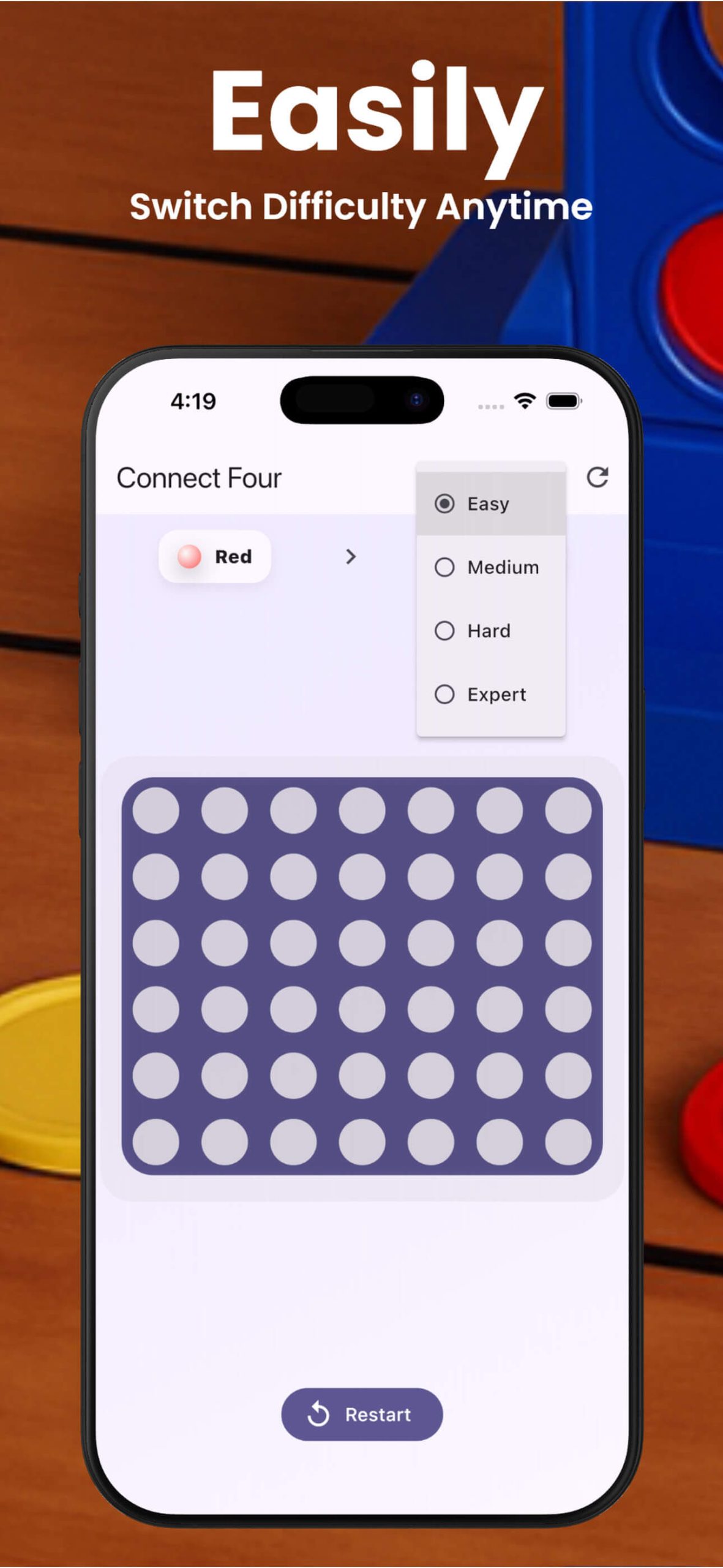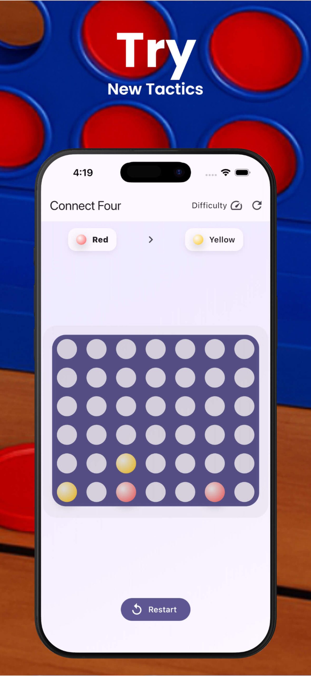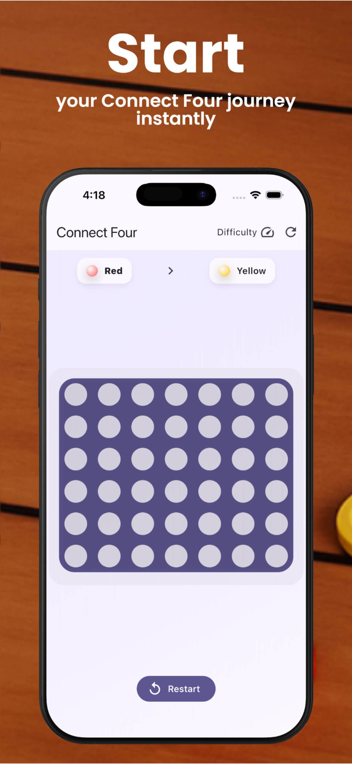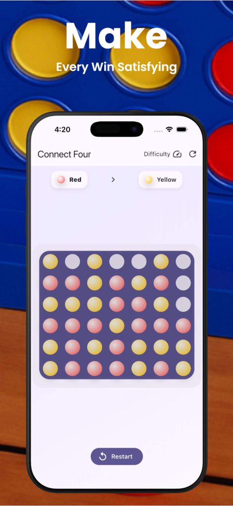 - Classic Connect Four gameplay with a modern mobile design